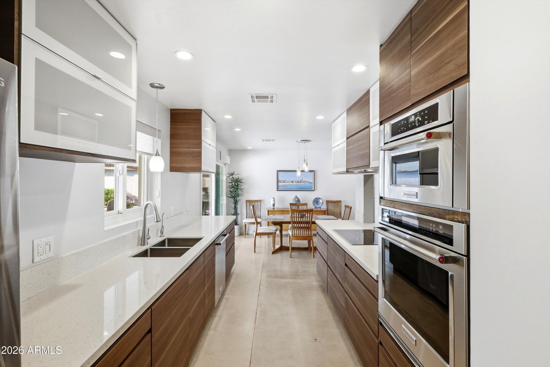 Mid-century modern home in the Pasadena neighborhood of Central Phoenix, originally built in 1956 and thoughtfully remodeled with permitted updates. The architecture stays true to its roots with clean lines, exposed block construction, and an open-concept layout, while extensive upgrades throughout provide long-term value and functionality. The kitchen anchors the main living space and is designed for both everyday living and entertaining, featuring walnut cabinetry with full-extension drawers, quartz countertops, a GE Profile induction cooktop, and a KitchenAid convection oven and microwave installed in 2024. Custom, hand-finished doors and cohesive cabinetry details carry throughout the home. Major system improvements include a new roof in 2023, Anderson windows installed within the last years, updated interior plumbing and sewer lines, and a full sewer line replacement to the alley in 2022. The home was fully rewired to current code with an updated electrical panel and includes a whole-house surge protector. The HVAC system is approximately eight years old, professionally serviced twice per year, and still carries remaining warranty coverage. The primary bedroom and living room feature remote-controlled shades, with the living room set up for Alexa integration. Additional upgrades include new exterior doors, updated lighting, new outdoor outlets, and drip and irrigation systems on timers. The backyard has been fully transformed with professional landscaping, a private pool with gas heater, a covered patio, and a 12x10 shed for additional storage. The front yard has also been refreshed to enhance curb appeal. Located near the Melrose District with convenient access to the light rail, shopping, dining, and everyday amenities including Uptown Plaza, The Henry, AJs Fine Foods, and the Phoenix Public Library, this home offers a balance of architectural character and modern updates in a well-established Central Phoenix location.