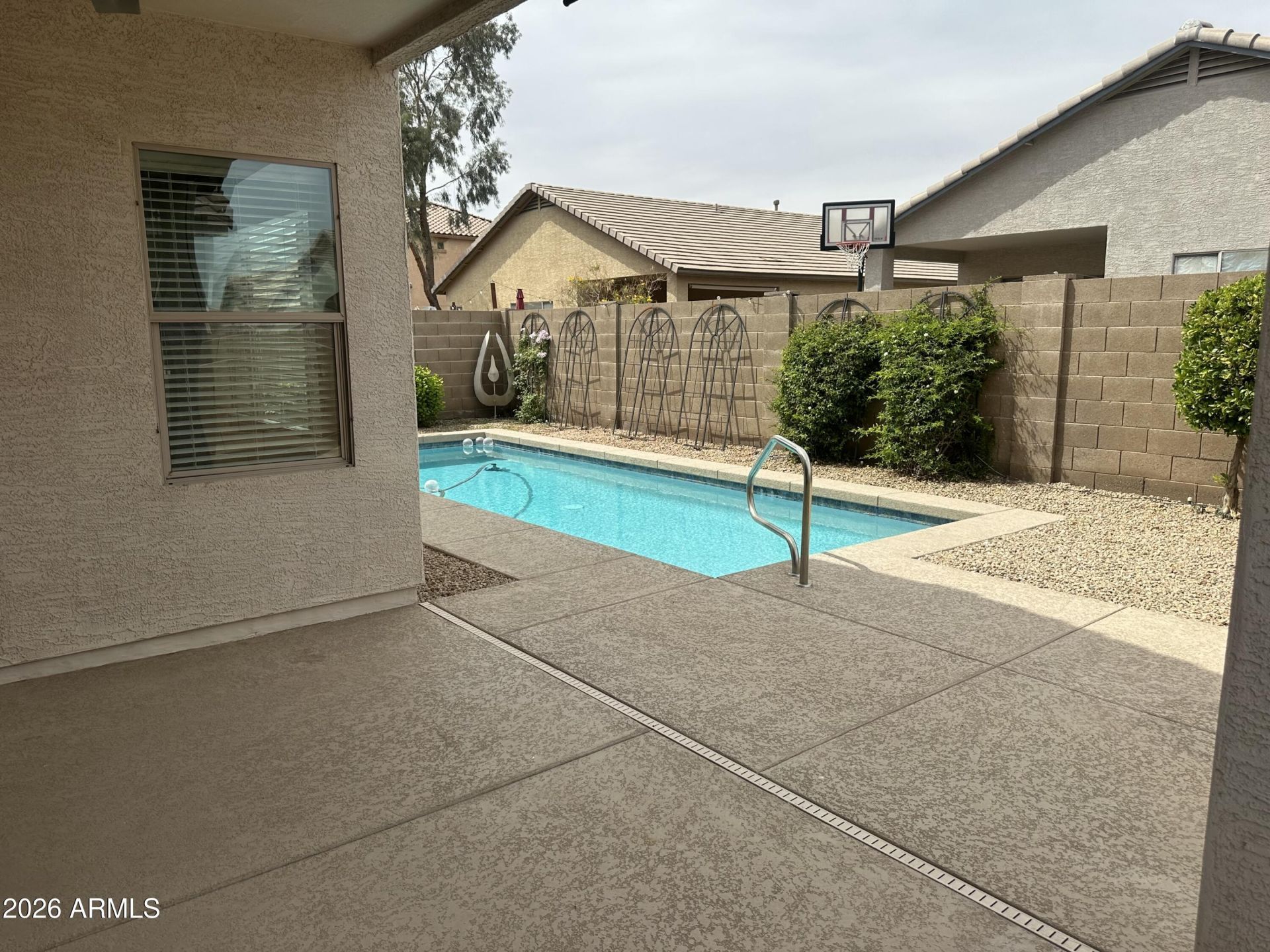 Beautiful 4 bedroom home! Enjoy a sparkling pool added in 2019! New HVAC 2021 for added efficiency & comfort! Interior features include extensive tile flooring, elegant stone accents, high ceilings, and granite countertops in kitchen. A spacious pantry provides ample storage, while indoor laundry room adds convenience. Washer, Dryer, & Refrigerator all stay with the home. Step outside to cool covered patio ideal for outdoor living & gatherings. Close to local parks/tot lot including community pool & basketball court plus American Sports Center near by - one of Arizonas largest indoor multi sport facilities! Make this HOME today!