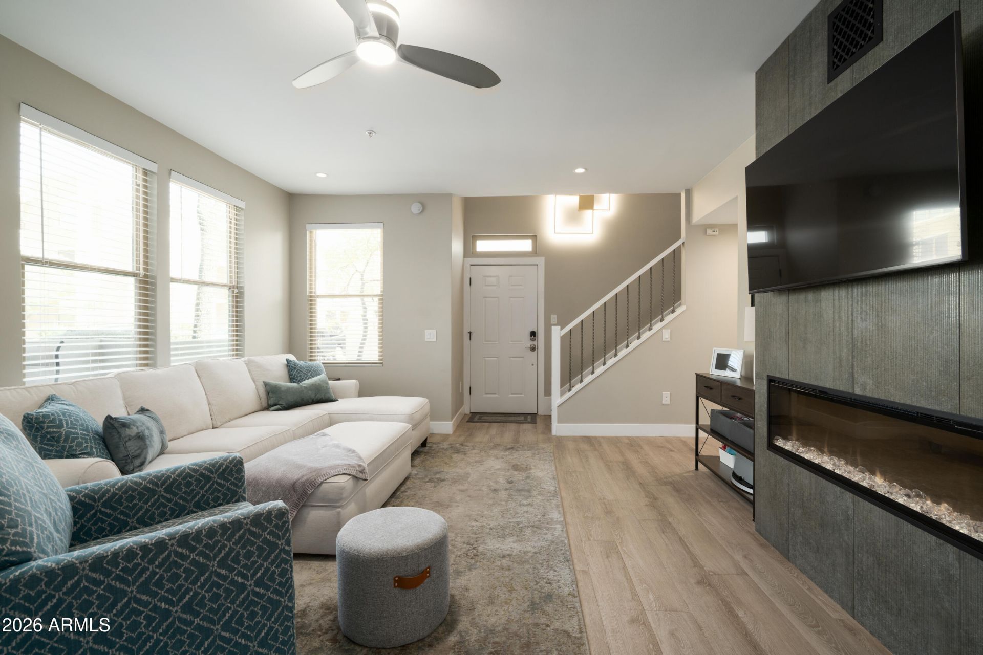 Rarely available, this fully renovated, stunning 3 bedroom, 2.5 bathroom luxury condominium in the Venu at Grayhawk is the one buyers wait for. The largest floor plan available with no one above or below, this exceptional home offers privacy, style, and an unbeatable Scottsdale lifestyle. From the moment you enter through the direct access ground-level entry with the security screen door, youll feel the quality and care throughout. Every detail has been thoughtfully upgraded, leaving nothing to do but move in and enjoy. The beautifully remodeled kitchen features soft-close cabinetry with interior and under-cabinet lighting, granite waterfall countertops, Basalt backsplash, stainless steel KitchenAid appliances, and a 5-burner gas cooktop. LVP flooring, 5-inch baseboards, and updated moldings add warmth and sophistication throughout. The family room is both inviting and dramatic with a sleek linear fireplace and tiled surround.Downstairs also features smooth-finish walls, neutral designer paint, an oversized half bath, and expanded under-stair storage. The open staircase with additional storage leads to the second floor, where youll find even more function with a large built-in linen closet. Upstairs offers 3 spacious bedrooms, including a generous primary suite with room for a king bed, nightstands, dresser, and more. The primary bath showcases dual sinks, quartz countertops, and an oversized walk-in shower wrapped in porcelain tile. The secondary bedrooms are well-sized and share a beautifully appointed full bath, and all bedrooms include walk-in closets. Major system upgrades include high-efficiency windows and sliding patio door, HVAC, water heater, reverse osmosis, water softener, and more. The oversized attached 2-car garage features new epoxy flooring and extra space for storage with a wider landing area. Outside, enjoy a large private patio with epoxy finish and a partially covered seating area. All of this inside the gated Venu community with 24-hour onsite security and incredible resort-style amenities including 4 pools with cabanas, 3 hot tubs, fireside seating, 2 movie theaters, game room, onsite chef, concierge, business center, conference room, 3,000-square-foot fitness center, free classes, bike rentals, and more. Walk to restaurants, grocery, and enjoy quick freeway access in one of Grayhawks most desirable locations. Come see why this home stands out!
