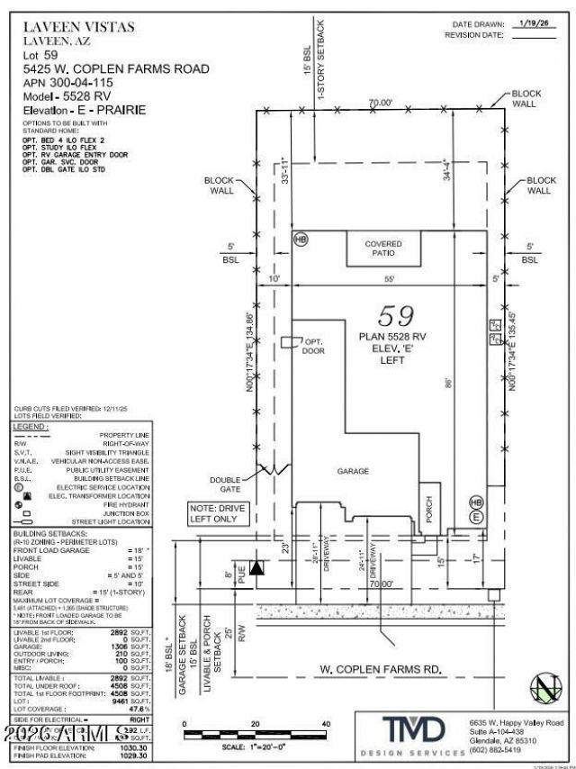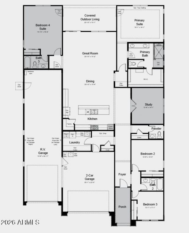 Whats Special: RV Garage | Large Kitchen Island | North Facing Lot | Dedicated Study. New Construction - July Completion! Built by Americas Most Trusted Home Builder. Welcome to the Overland at 5425 W Coplen Farms Road in Salero at Laveen Vistas Journey Collection! Spacious and inviting, this thoughtfully designed home welcomes you through a charming foyer flanked by two bedrooms and a full bathroom. Just outside the dedicated study, a convenient powder room and nearby laundry room add ease to everyday living. At the heart of the home, open-concept living shines as the great room flows seamlessly into the casual dining area, kitchen with an island, and a covered patio perfect for entertaining with ease. One side of the great room features a private secondary bedroom with an ensuite bath, ideal for guests. Tucked away on the opposite side, the primary suite offers a peaceful retreat with a roomy walk-in closet and a beautiful primary bath. Completing the home are a two-car garage and a spacious RV garage, adding both function and flexibility. Salero Journey Collection offers a warm, welcoming neighborhood atmosphere just minutes from South Mountain Park, giving you effortless access to the deserts natural beauty. Its prime location near the Loop 202 South Mountain Freeway also provides quick, convenient connections to major destinations throughout the Valley. Additional Highlights Include: bed 4 suite and bath 3 in place of flex 2, study in place of flex, garage service door, double gate in place of standard, lite glass interior doors at study in place of flex, RV garage entry to interior, gourmet gas kitchen, ceiling fan pre-wires at bedrooms, great room, study, and covered patio, EV pre-wire at 2-car garage, engineered marble counters at secondary baths, AV sleeve at great room, engineered marble super shower at primary bath, tiled kitchen backsplash, pots and pan drawer, raised vanity at bath 2 & 3, recycle center at kitchen, comfort height toilets at all baths, upgrade carpet and tile, pre-plumbed for water softener, and gas line for future outdoor kitchen. MLS#7016869