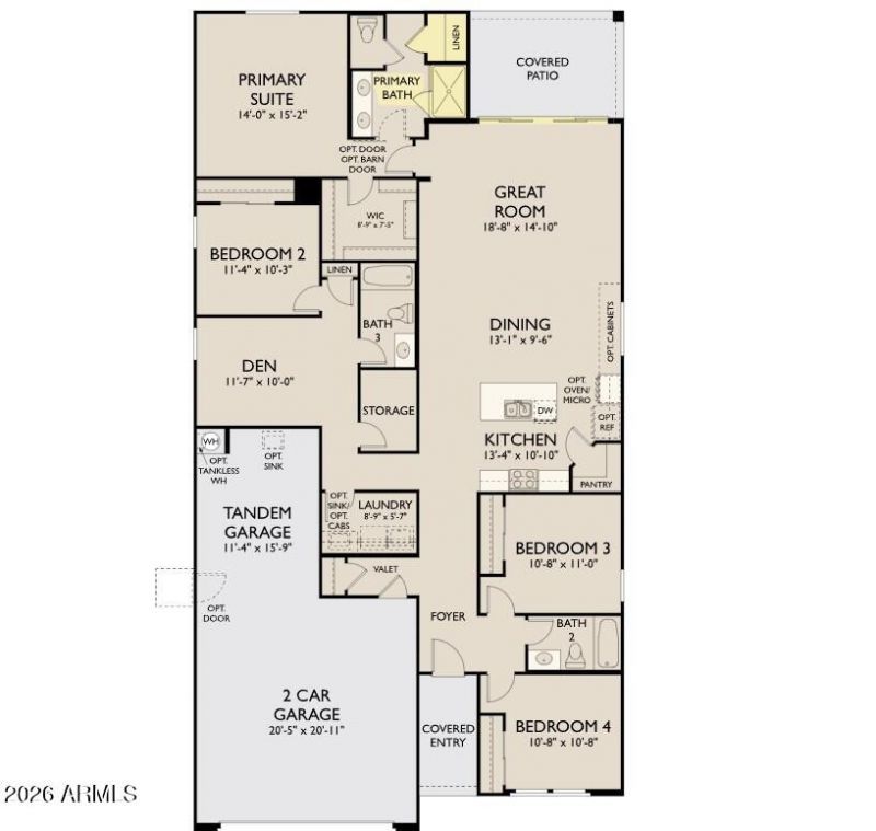 Introducing the Sage Plan, a brand new luxury Studio Collection plan at Aloravita--where refined desert living is elevated with a distinctive Harmony designer touch and showcased in a stunning farmhouse elevation.This beautifully appointed single-story home blends crisp finishes with warm, grounding tones--creating a space that feels both elevated and effortlessly inviting. Featuring 4 bedrooms, 3 baths, a private den, and a 3-car tandem garage with a garage service door, the Sage offers exceptional versatility wrapped in sophisticated design.The farmhouse exterior delivers timeless curb appeal with clean lines and welcoming character, enhanced by a pavered entry and EV outlet.Inside, the expansive great room serves as the heart of the home, where a dramatic 4-panel sliding glass doo creates seamless indoor-outdoor living--opening to a covered patio ideal for entertaining or enjoying tranquil desert evenings.The gourmet kitchen is a true statement of cohesive design, showcasing all-white cabinetry, quartz countertops, and a designer tile backsplash. A premium GE Profile appliance suite--including a 36 gas cooktop, chimney hood, and built-in wall oven and microwave--is complemented by elegant champagne bronze hardware, adding warmth and a refined designer touch.Throughout the home, soft neutral tones, clean lines, upgraded flooring, and 8-foot interior doors enhance light, scale, and flow. Bathrooms continue the elevated aesthetic with matching white cabinetry, creating a clean, cohesive look and a bright, airy feel throughout.The enlarged primary suite offers a private retreat, complete with dual quartz vanities and an expansive tiled shower designed for a spa-like experience.Set within the highly desirable Studio Collection at Retreat at Aloravita, the Sage Plan is a seamless blend of farmhouse charm, thoughtful design, and elevated finishes--crafted for those who appreciate intentional living and a true designer touch.