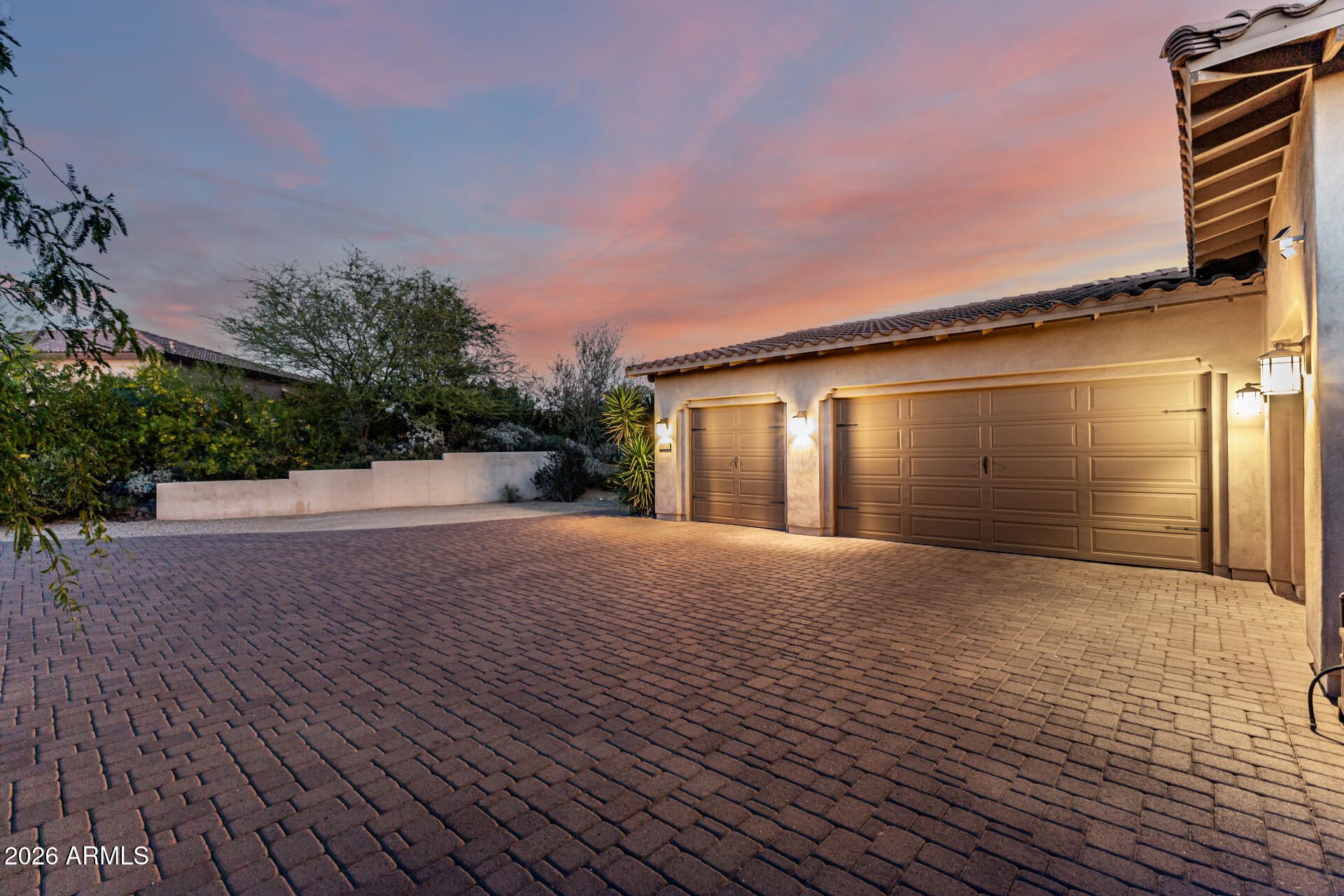A sweeping paver motor court, resort-style backyard, and oversized multi-car garage set this home apart from the start. Designed for both everyday comfort and effortless entertaining, this single-level residence offers soaring ceilings, abundant natural light, plantation shutters, and warm wood-look tile throughout the main living spaces.The open great room floor plan flows seamlessly into a beautifully appointed kitchen featuring rich cabinetry, granite countertops, stainless steel appliances, double wall ovens, a striking backsplash, and a large island with bar seating. Oversized sliding glass doors create a seamless indoor-outdoor connection to the covered patio and backyard retreat. The spacious primary suite offers a true escape with a spa-inspired bath, soaking tub, oversized walk-in shower, dual vanities, and an impressive custom walk-in closet. Secondary bedrooms are generously sized, and the dedicated office provides ideal flexibility for work or hobbies.The backyard is built for Arizona living with a sleek pool and spa, expansive travertine decking, built-in BBQ, outdoor fireplace, covered lounge space, gazebo seating area, low-maintenance turf, and attractive desert landscaping. The finished garage offers exceptional space for vehicles, bikes, storage, or projects. A rare blend of comfort, function, and standout outdoor living.